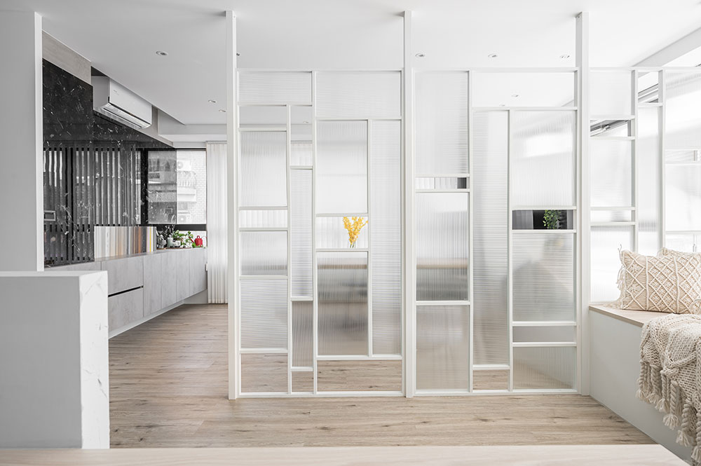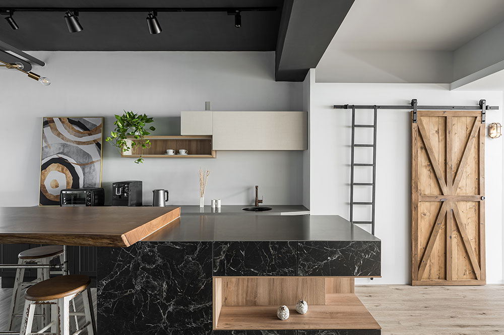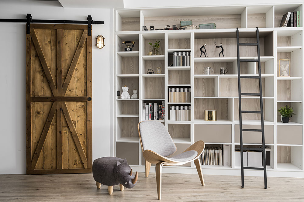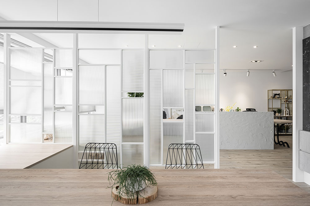 The natural lighting penetrates the whole space and gently sprinkles on the wooden floor. The rustic, pale wood tone with Scandinavian humanistic charm complements the grayish-black American Industrial style. Ingeniously, bringing about a comfortable and agreeable atmosphere via integrating the two very different design styles. Ingeniously space out each office area via different settings such as an iron-framed glass screen, a diatomaceous earth coating partition with excellent moisture absorbing and deodorizing features, and a European-designed eco-friendly modular cabinet. The airy and roomy space possesses multiple functions like planning projects, receiving customers, holding meetings, and storing sample products. Moreover, the sloping-patterned interior facades skillfully fulfill a vivid and lively design. Tell apart the refreshment area from the office area with a relaxed, homely vibe, catering to the needs of comfortable socializing and favorable to change moods within different settings. Set the refreshment area in an avant-garde, fashion black tone; moreover, exploit natural, rough hollow bricks to fashion the American Industrial style. The office area is open and bright with light-colored arrangements and fresh greeneries, showing the Scandinavian humanistic implications and soothing work fatigues at ease. The sloping ceiling of the refreshment area skillfully decorates the crossbeams, extends vision, and adds enchanting scenes to the space. Also, set a slanted open-patterned bookcase in the multi-functional area to leave adequate space for the adjacent negotiation area and enhance dynamic linear features of the plane layout. Install European eco-friendly wooden gratings between the refreshment area and negotiation area to create a penetrating and lightsome space. Erect the meeting room partitions with iron frames and matte glasses to meet the need for holding privacy while discussing project plans. Take advantage of diatomaceous earth paint that possesses moisture-absorbing features to finish the semi-height wall. And then situate it in front of the long office desk, glamorously bringing a lively ambiance via the irregular pattern. And arrange large-scale storage and display cabinets along the walls, ultimately achieving an airy, full-functioned design studio.